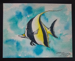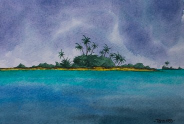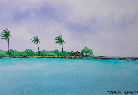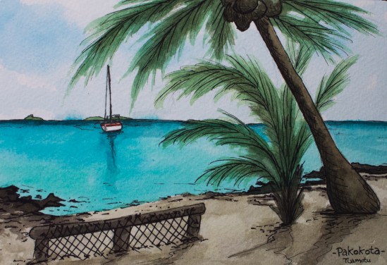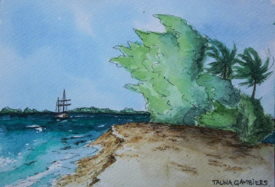 Arrivés aux Gambier (Est de la Polynésie), j’ai pu reprendre mes aquarelles. Les palmiers et les atolls sont bien différents des glaces et des montagnes d’Antarctique… Je m’adapte tranquillement à ce nouvel environnement où les couleurs et la vie ne manquent pas.