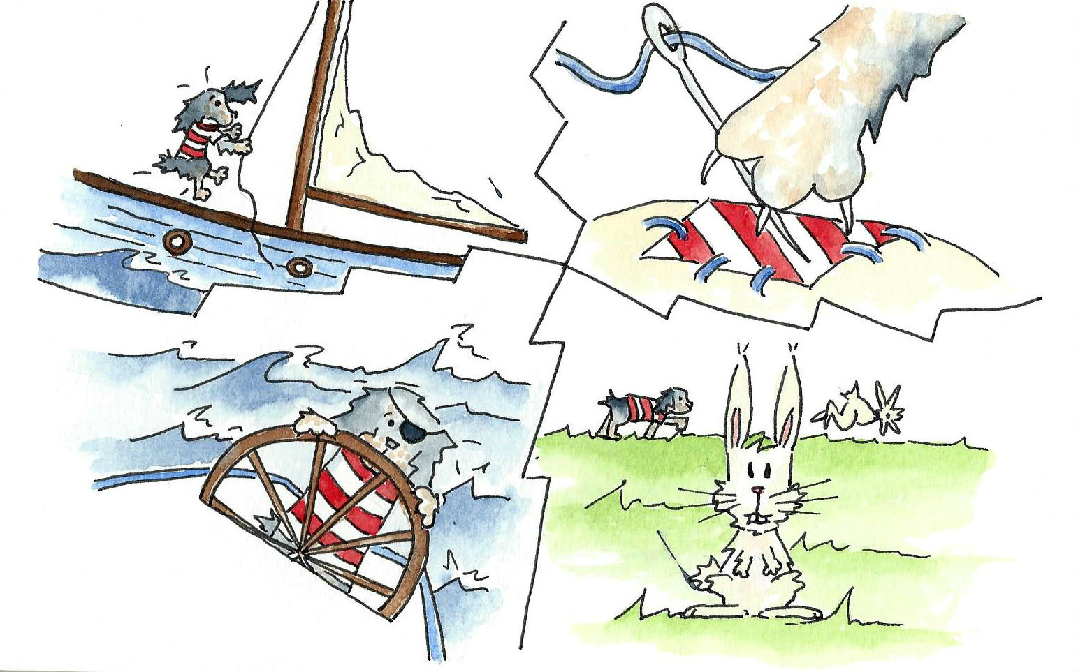 Pendant ce temps, Chris le Téméraire était très inquiet. Fanette ne revenait pas de sa promenade quotidienne. Le matin même, il avait vu un petit voilier disparaître au large et il s’inquiéta que ce soit la chienne têtue qui voulut naviguer en solitaire. La tempête se levait rapidement et sans plus attendre, Chris partit sur son bateau à la recherche de la Fanette.
