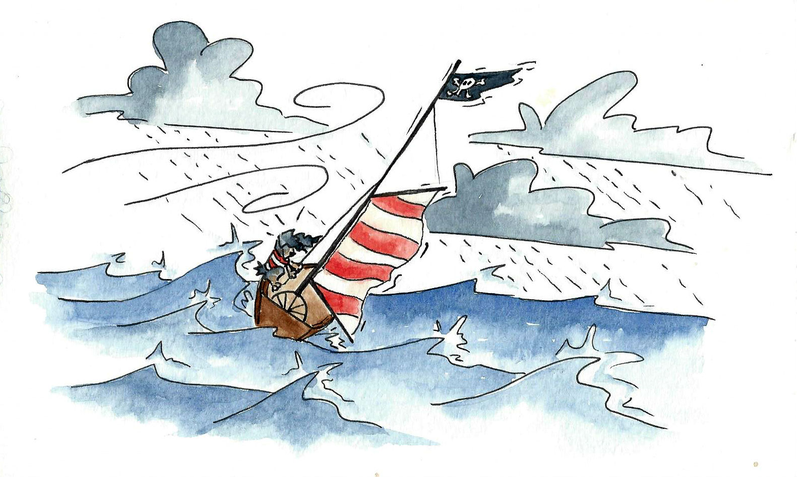 Malheureusement, le soleil fit rapidement place aux nuages, à la pluie et au vent. Une grosse tempête s’abattit sur Fanette et son petit bateau. Habituée à se faire donner des ordres, Fanette était perdue. Elle décida d’affaler la grand voile, mais dans la manœuvre une rafale violente déchira la voile et brisa le mât…