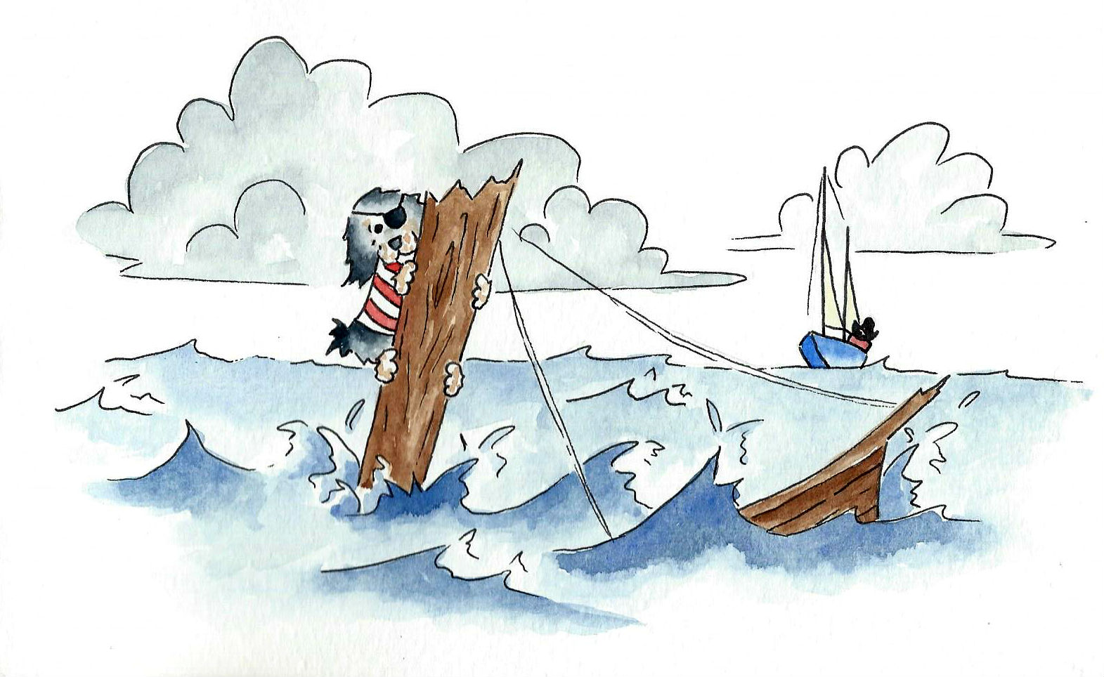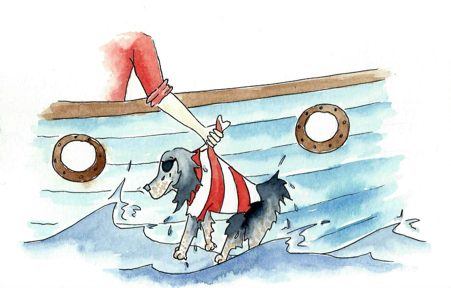 Le vent et les vagues faisaient valser le bateau de tous les côtés, mais Chris était bien décidé à retrouver la chienne perdue. À travers le rugissement du vent, il finit par distinguer une voix qui criait «AU SECOURS!» et bientôt il aperçût la Fanette suspendue à son bout de mât, désespérée.